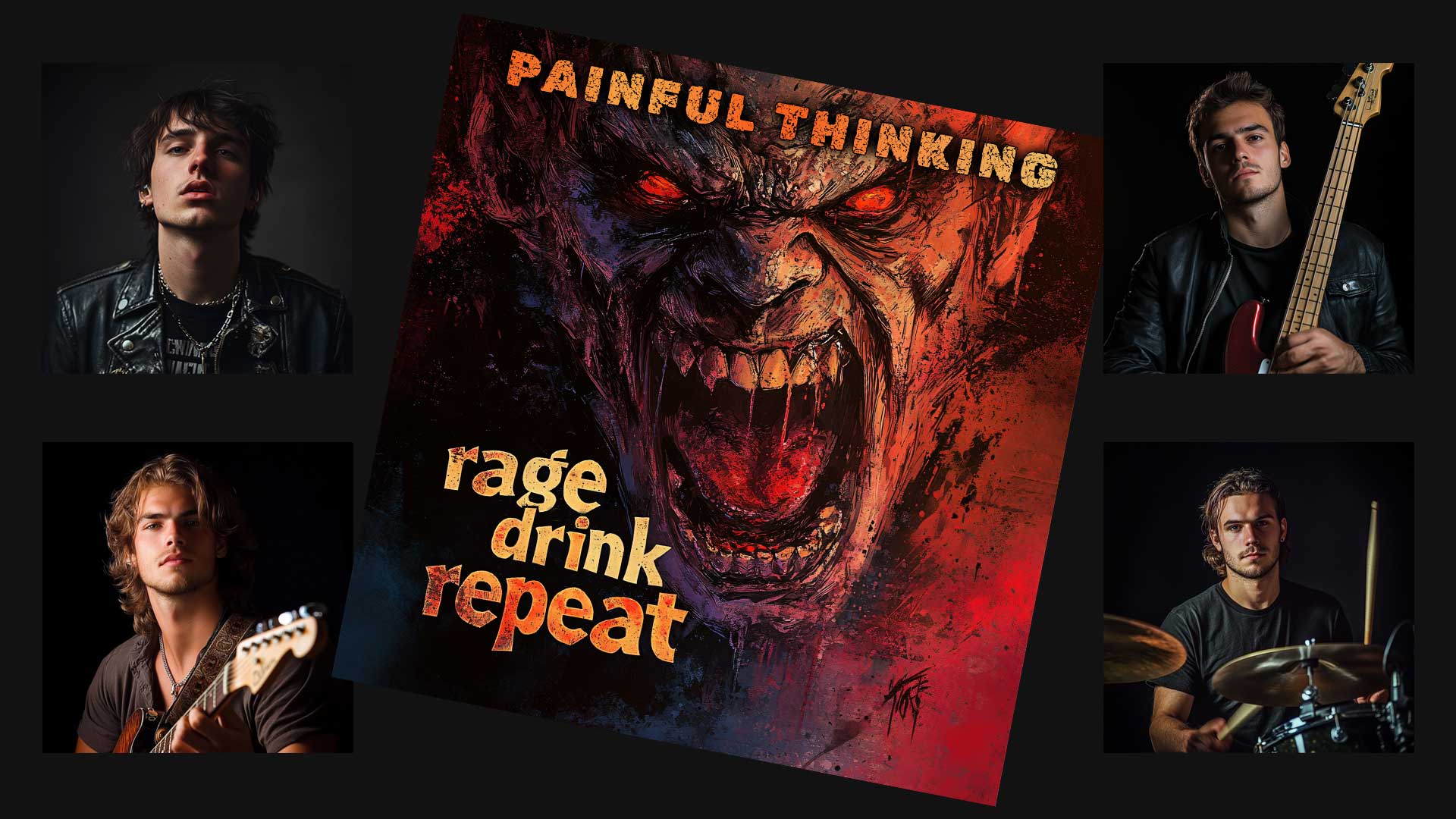 Mit „rage – drink – repeat“ taucht Painful Thinking tief in die Abgründe des modernen Lebens ein. Die Texte spiegeln Themen wie Wut, Verzweiflung und die endlose Wiederholung des Alltags wider und regen zum Nachdenken an. Musikalisch bewegt sich das Album zwischen melancholischen Balladen und energiegeladenen Nu-Rock-Tracks, die sowohl zum Nachdenken anregen als auch zum Mitrocken einladen.